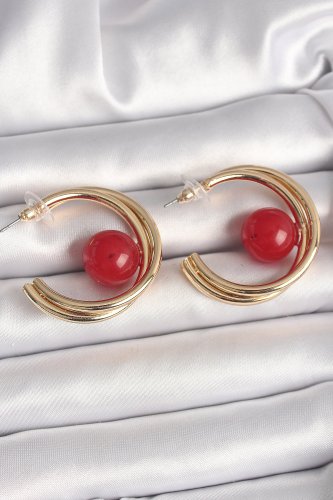 • Pirinç Gold Renk Halka Model Kırmızı Boncuk Detay Kadın Küpe