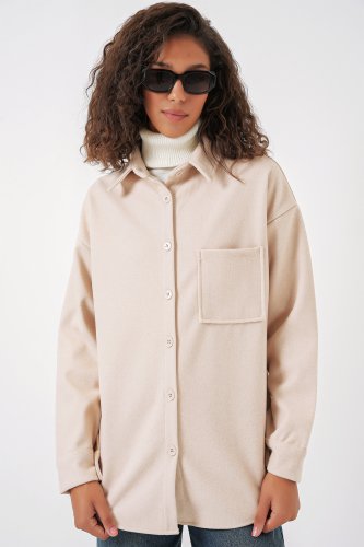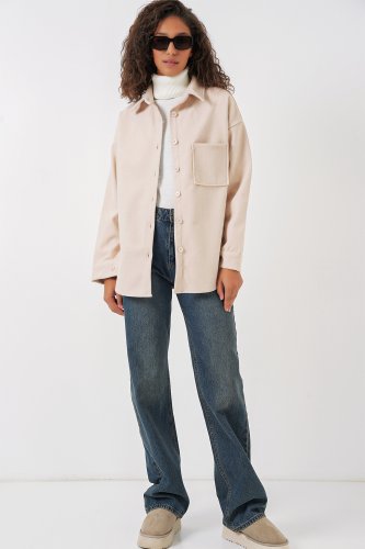 20273 Tek Cepli Düğmeli Kaşe Gömlek Krem