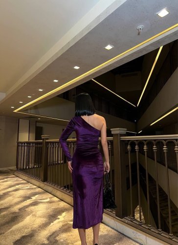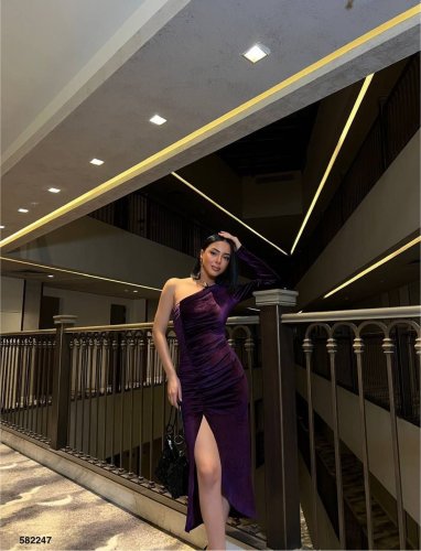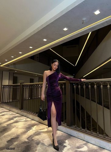 • Kadın uzun kollu omuz dekolteli büzgü ve asimetrik yırtmaç detay elbise