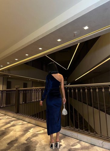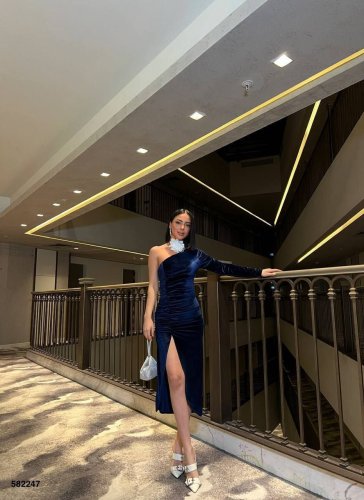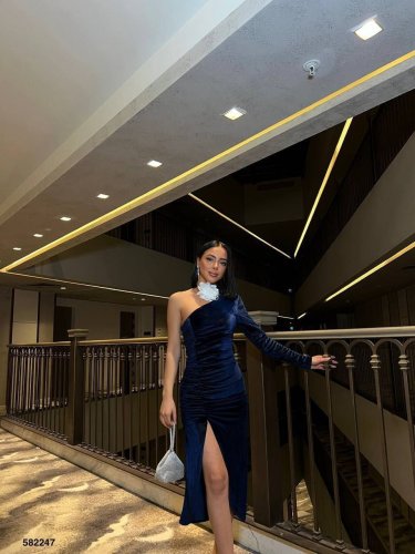 • Kadın uzun kollu omuz dekolteli büzgü ve asimetrik yırtmaç detay elbise