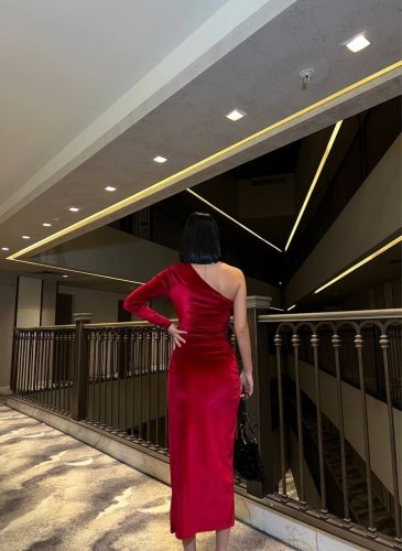 • Kadın uzun kollu omuz dekolteli büzgü ve asimetrik yırtmaç detay elbise