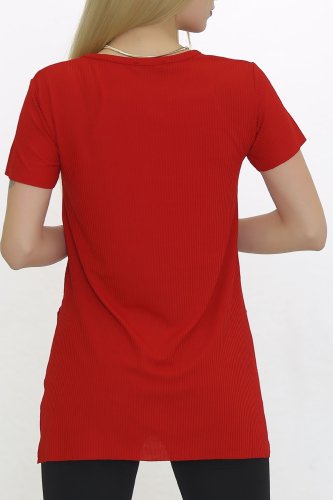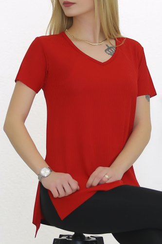 • V Yaka Yırtmaçlı Tişört Kırmızı