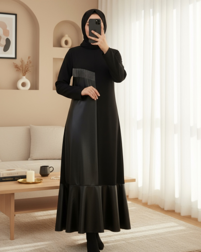 Deri Detaylı Metal Zincirli Elbise Siyah