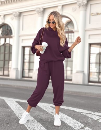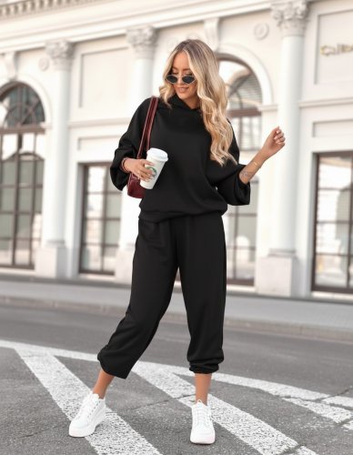 Kadın uzun kollu kapşonlu viskon iki iplik bluz ve pantolon ikili takım